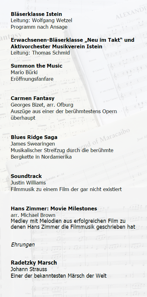 Parallel sind wir aber auch schon in der Vorbereitung unseres Jahreskonzertes am 12. April 2025. Am Jahreskonzert werden wir gemeinsam mit der „Bläserklasse Istein“ sowie der Erwachsenenbläserklasse „Neu im Takt“ auftreten. Ihr dürft gespannt sein.