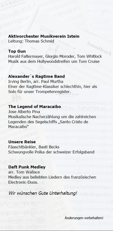Momentan bereiten wir uns gerade auf den Zunftabend der Narrenzunft Isteiner Drübel am Samstag den 15. Februar vor, den wir auch in diesem Jahr wieder musikalisch begleiten.